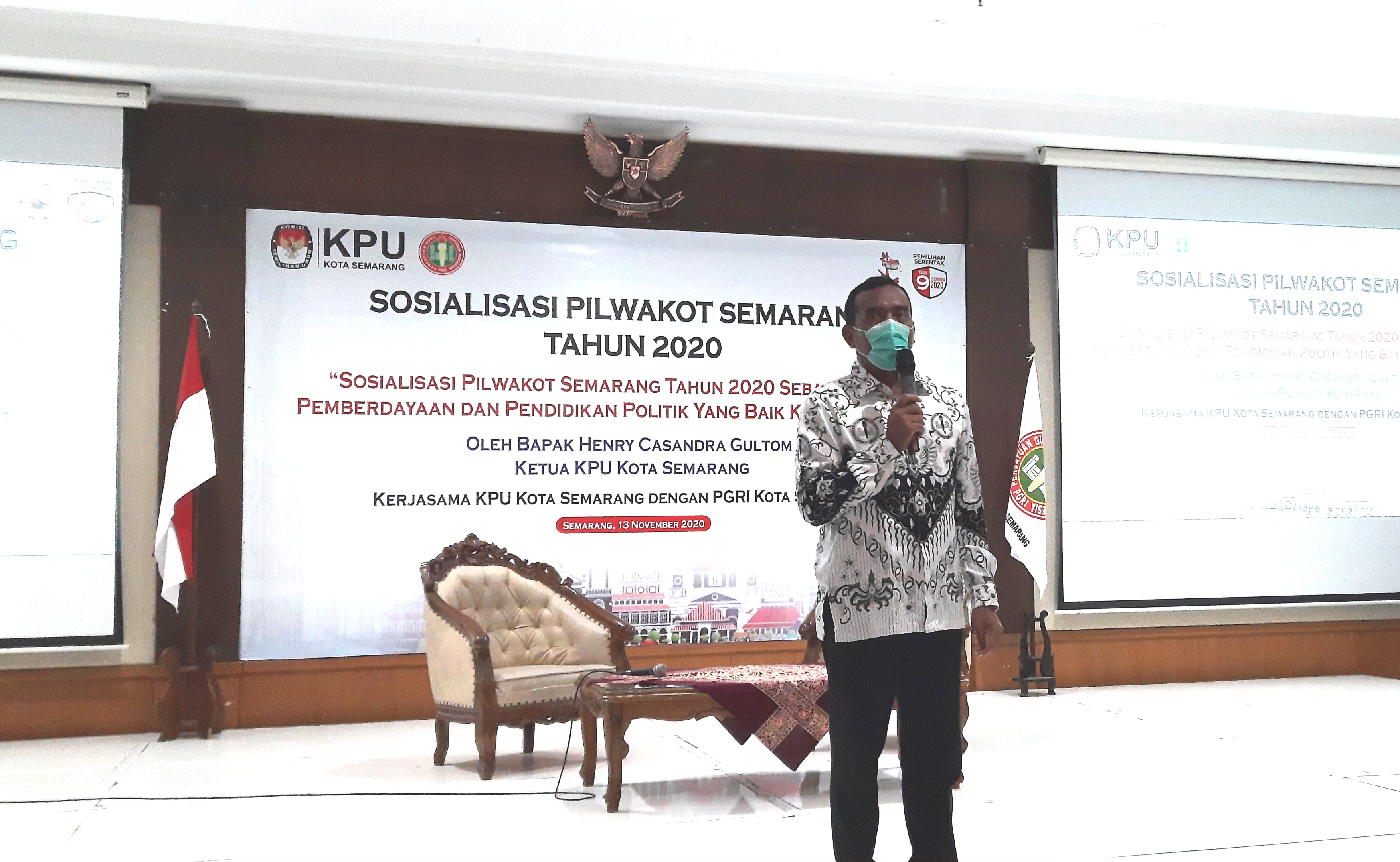 [Jum'at, 13 November 2020] Kegiatan Sosialisasi Pilwakot Semarang yang diselenggarakan pada jum'at kemarin diisi langsung oleh Ketua KPU Kota Semarang yaitu Bapak Henry Casandra Gultom. Kegiatan tersebut dilaksanakan di Kampus 4 Universitas PGRI Semarang yang terletak di Jl. Gajah Raya.